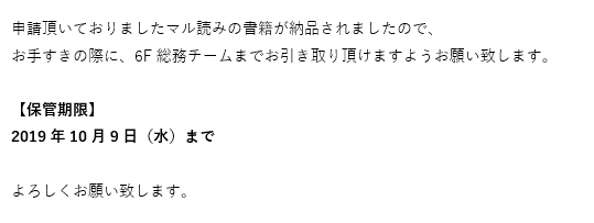こんな感じで本が届くと総務チームからメールでお知らせが来るので、助かります!