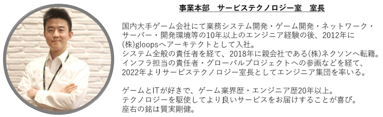 サービステクノロジー室は事業本部に所属しており、ネクソン日本法人におけるIT全般をつかさどっている部門になります。オンラインゲームの商用システムでは開発系と基盤系のエンジニア、社員向けの業務システムでは情報システム系のエンジニアが活躍しています。
